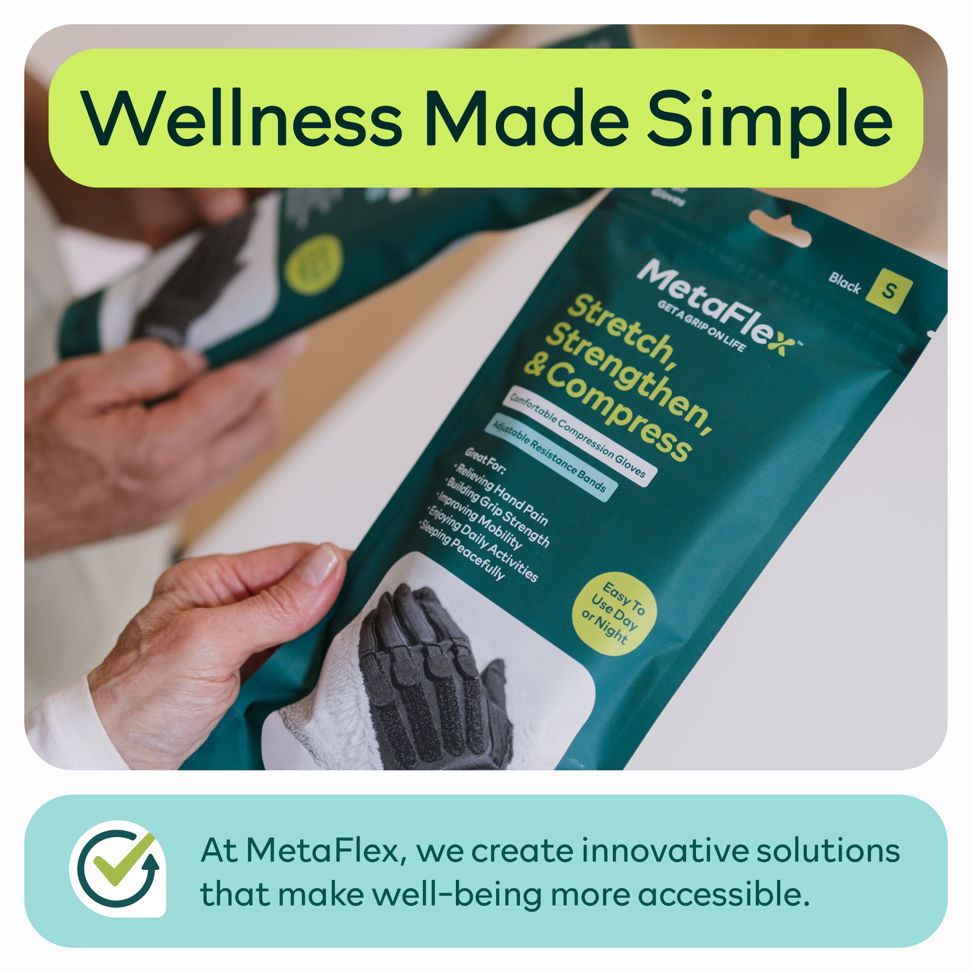 MetaFlex is the ultimate recovery tool - with gentle compression and dynamic resistance bands, our gloves are the easiest way to improve your hand function and get back to doing what you love.